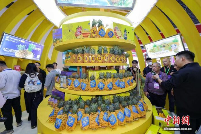 Em 4 de dezembro, na 28ª Feira de Inverno de Produtos Agrícolas Tropicais da China (Hainan) de 2025, o abacaxi de Hainan atraiu os visitantes. (Foto: Luo Yunfei)