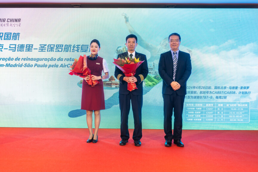 No dia 30 de abril, foi realizada em São Paulo a cerimônia de retomada do voo da Air China, que liga Beijing, Madrid e São Paulo. O voo CA897 da Air China, que faz a rota Pequim-Madrid-São Paulo, chegou ao Aeroporto Internacional de Guarulhos em São Paulo, onde foi recebido com a saudação tradicional de “water salute” em celebração ao reinício desta importante rota que conecta três continentes após quatro anos.
