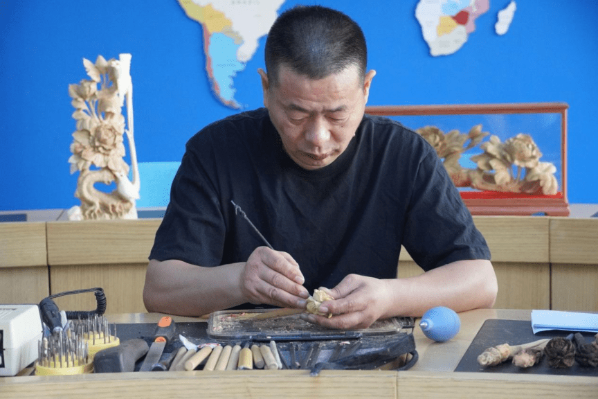 Durante a palestra, Gao exibiu sua coleção de pentes de cabelo no estilo tradicional chinês, inspirados na beleza das peônias em plena floração no Jardim da Peônia de Heze, um espetáculo que ocorre todo mês de abril. Ele realizou uma demonstração ao vivo, transformando uma raiz de zimbro grosso em um elegante pente de cabelo por meio de processos como design, esboço, corte bruto, refinamento e polimento. Gao destacou que cada peça é única, pois as técnicas tradicionais de escultura em raiz não permitem a reprodução em massa.