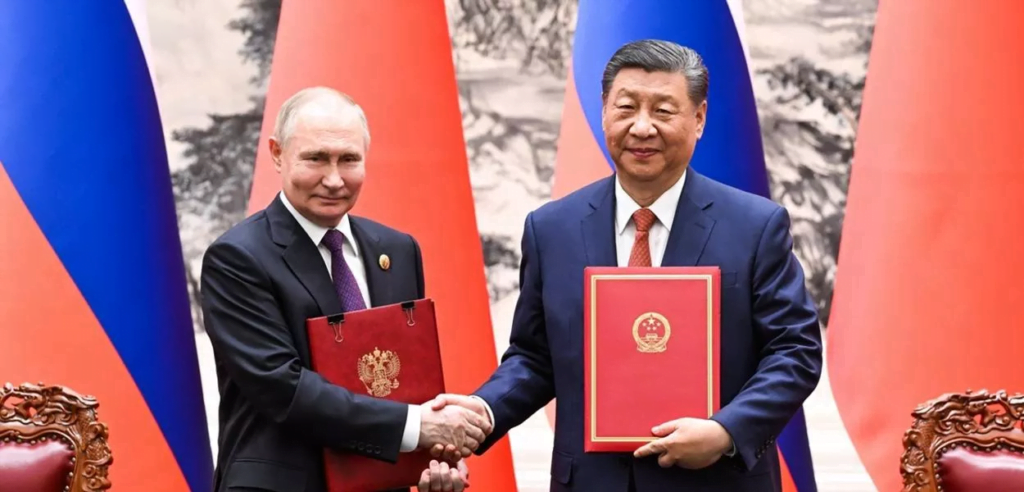 Lá, os presidentes Xi Jinping e Vladimir Putin assinaram uma declaração conjunta comemorando o 75º aniversário das relações diplomáticas. No documento, China e Rússia criticaram o “colonialismo e hegemonismo” ocidentais, pediram a construção de um mundo mais multipolar com maior representação para o Sul Global e expressaram apoio à desdolarização e à expansão do BRICS.