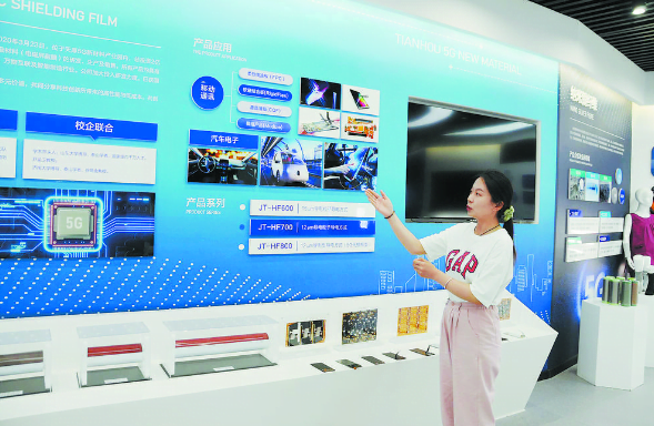 Dentro do pavilhão do Parque Industrial de Novos Materiais de Fibras de Alta Qualidade em Huaze, um funcionário está apresentando os produtos da empresa. O projeto, com um investimento total de 5,8 bilhões de yuans, tem como meta a produção anual de 300 milhões de metros de tecidos de alta qualidade, além de novos materiais funcionais e vestuário de alta gama para atividades ao ar livre. Esse é o maior investimento individual já realizado no distrito de Dingtao, na cidade de Heze, província de Shandong. O projeto é uma parceria da empresa de Suzhou Zhongjia com sete outras empresas líderes no setor, especializadas em inovação. Com uma cadeia industrial completa que inclui revestimento de fios, tecelagem, tingimento, acabamento, tecidos de alta qualidade, vestuário de luxo e novos materiais funcionais, o parque se tornará, ao estar totalmente operacional, um centro de pesquisa e desenvolvimento e uma base de produção de novos materiais de fibras de alta qualidade líder em tecnologia no país. A expectativa é que o valor da produção anual ultrapasse 20 bilhões de yuans e que os impostos excedam 1 bilhão de yuans.