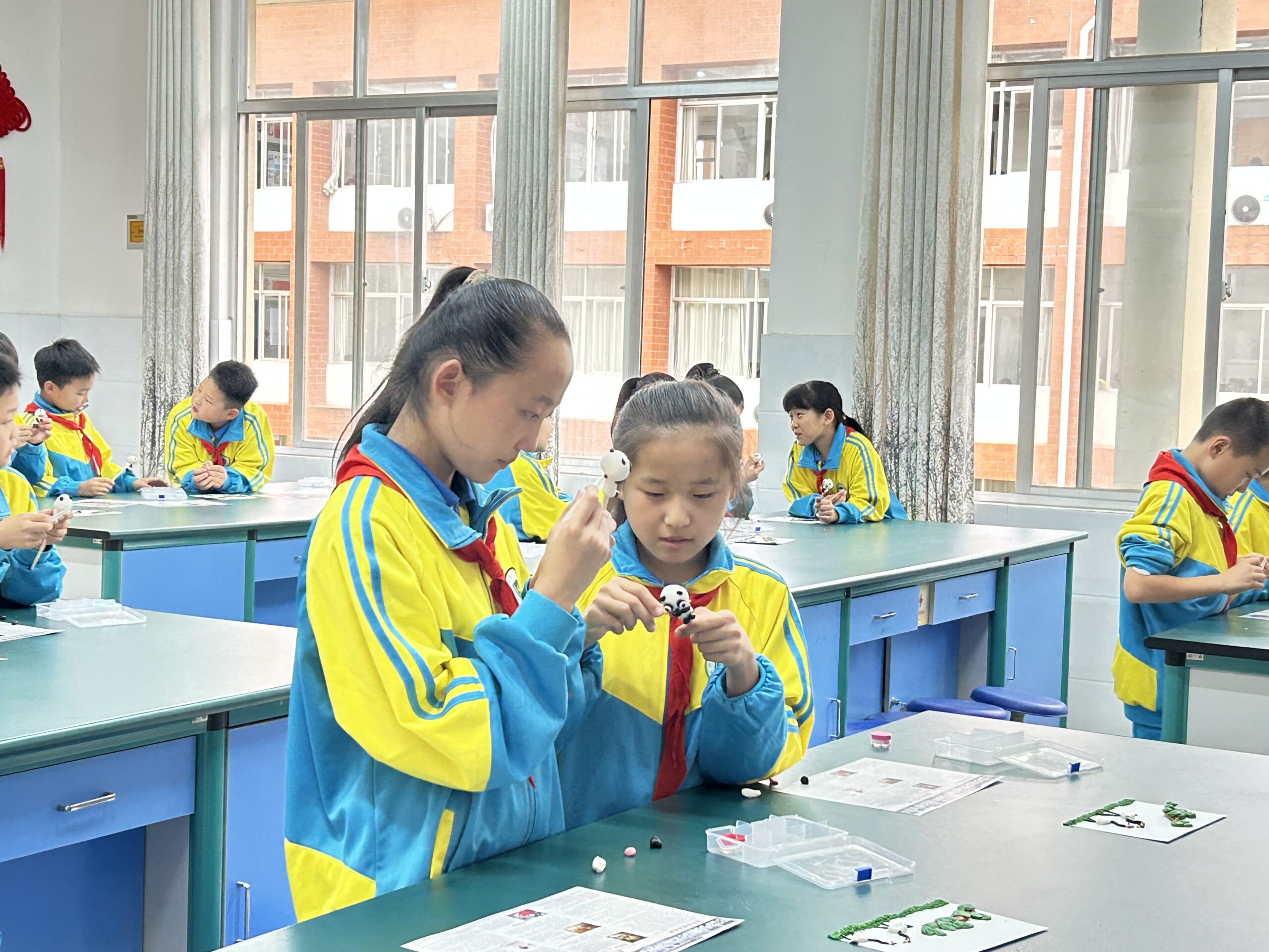 Durante o evento, o Professor Li Bin compartilhou de maneira educativa e envolvente com os alunos a origem, o desenvolvimento e a transmissão da cultura artística da escultura de massa, estimulando o fervoroso interesse dos estudantes na criação de suas próprias esculturas de massa. Ao mesmo tempo, com o objetivo de promover a virtude tradicional chinesa de “respeito aos mais velhos”, sob a orientação do professor, os alunos desenvolveram obras temáticas em torno de “criar uma escultura de massa para os idosos”. Com dedicação e amor, eles deram forma às suas próprias criações, utilizando a grua de cabeça vermelha como símbolo de longevidade, representando os melhores votos das crianças para os idosos. Após quase uma hora de amassar e modelar, as coloridas massas nas mãos das crianças se transformaram em esculturas de massa únicas e distintas.
