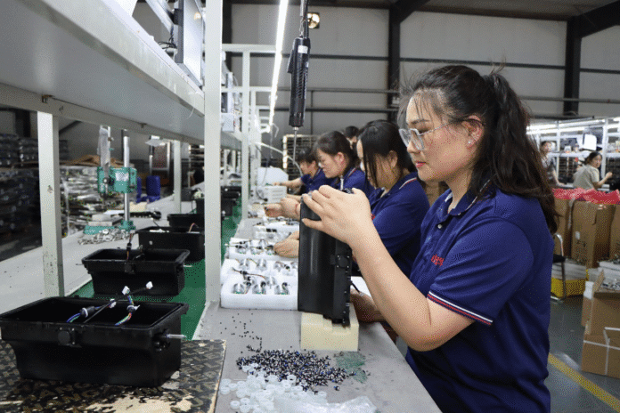 HEZE, Shandong, 17 de junho de 2025 — Operários montam módulos de motores para robôs de piscina nas linhas de produção da Shandong Huaze Electric, na Nova Área de Luxi. Especializada em aspiradores, limpadores de piscina e liquidificares industriais, a empresa domina toda a cadeia produtiva — do desenvolvimento de moldes plásticos à fabricação final.