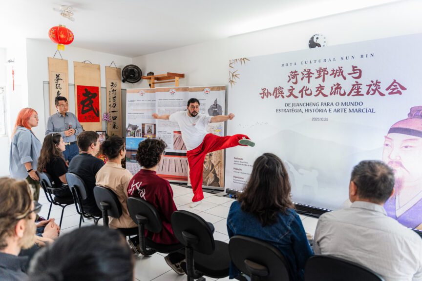 Ele também apresentou o trabalho da Associação de Artes Marciais Sun Bin Quan do Brasil, dedicada há anos à promoção da cultura das artes marciais chinesas no país. Além do ensino de Sun Bin Quan, a entidade oferece cursos de língua chinesa e outras disciplinas culturais, atraindo muitos alunos brasileiros. A proposta da associação é que, por meio de um ensino sistemático, mais brasileiros conheçam a beleza da língua chinesa e a profundidade do pensamento chinês. “Esperamos que cada aluno — seja nas artes marciais, seja no estudo do chinês — possa sentir, durante o aprendizado, a harmonia e a sabedoria da cultura chinesa”, disse o Dr. Rogério Macedo.
