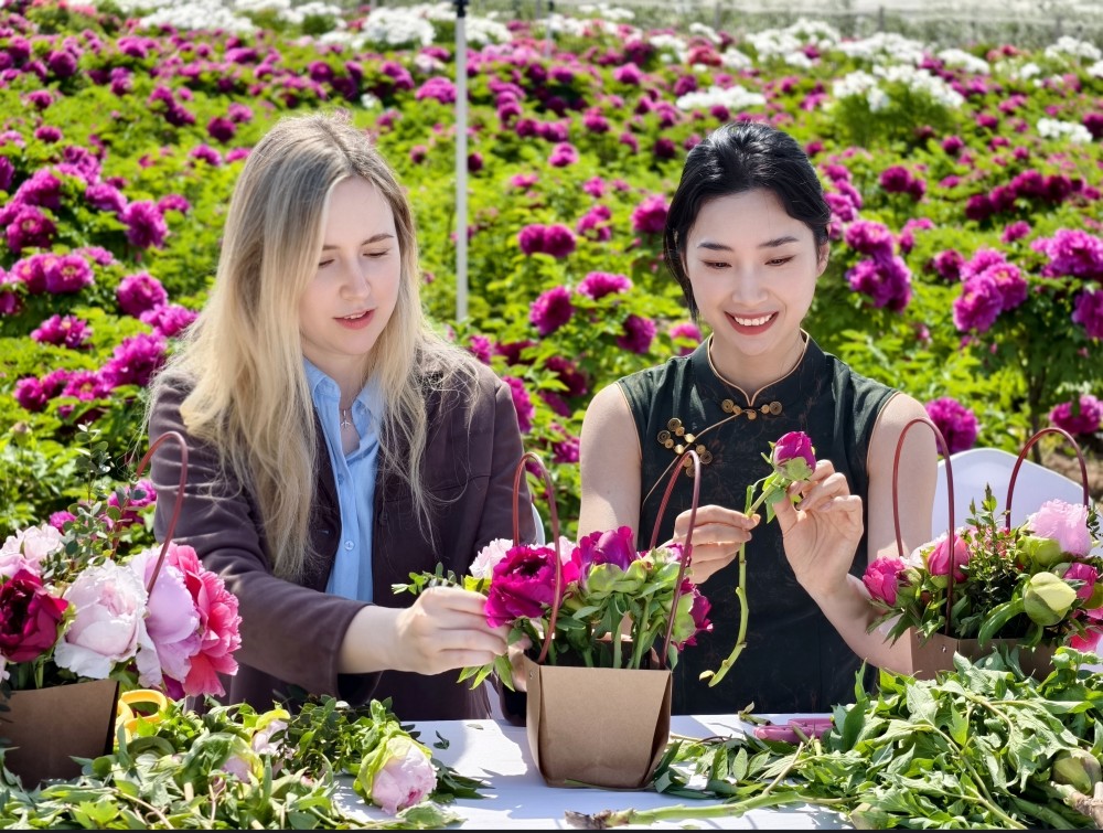 No Parque Industrial Yaoshun Mudan, conheceram produtos derivados da peônia, incluindo itens alimentícios, suplementos e peças artísticas. Jiang Chen, estudante do Tajiquistão, destacou a diversidade da cadeia produtiva: “Nunca imaginei que a indústria da peônia fosse tão ampla. É uma integração impressionante entre tecnologia e tradição”.
