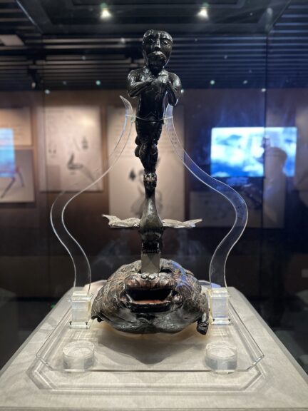 Na área dedicada às peças de laca, o grupo foi profundamente impactado pela exposição “O encanto da laca vermelha — peças selecionadas de laca dos períodos Chu, Qin e Han”. Uma das obras mais marcantes, o tambor suspenso com escultura de fênix sobre tigre, chamou atenção por sua forma singular, cores vibrantes e ricos detalhes decorativos.
