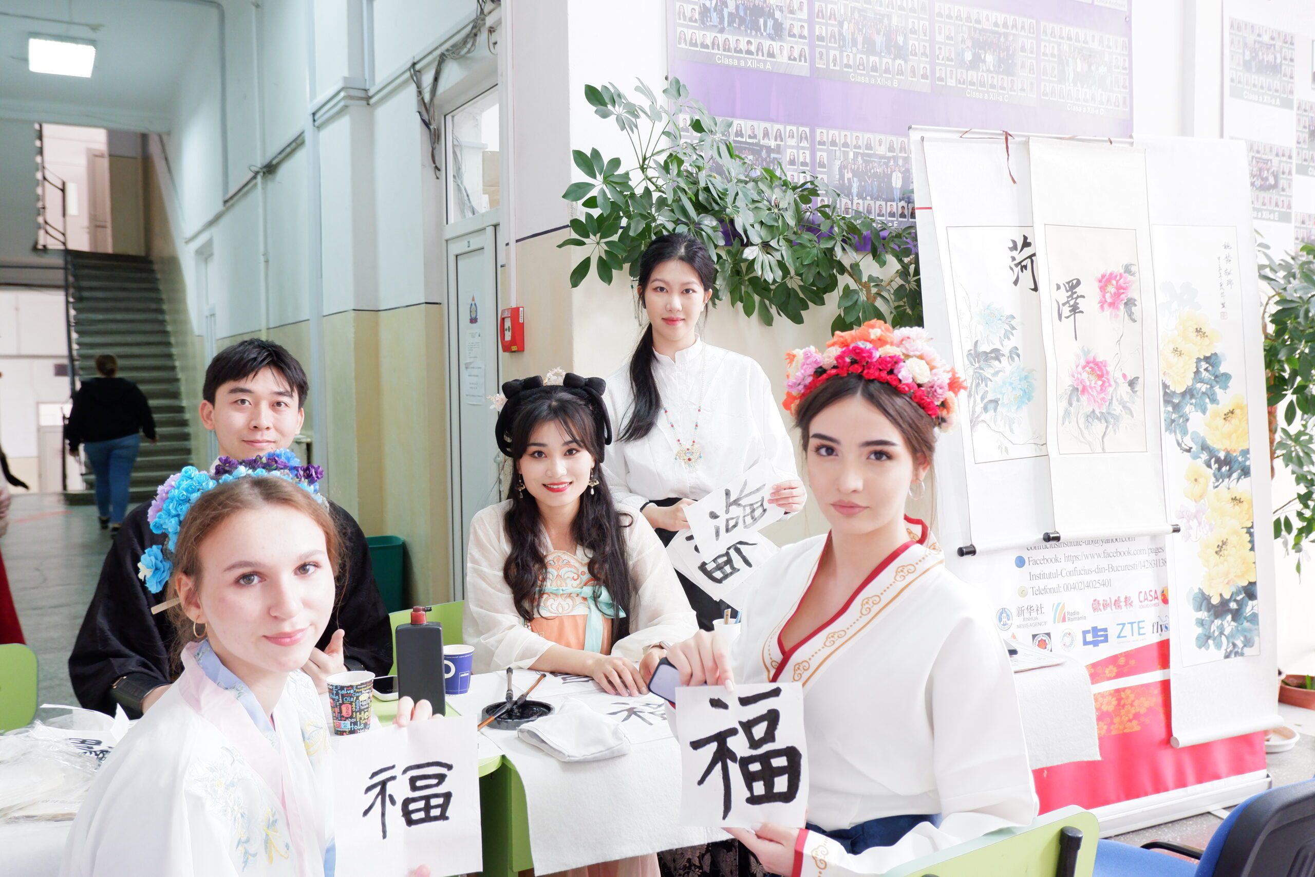 A zona de experiências interativas foi outro destaque. Professores de chinês internacional, vestidos com trajes tradicionais, ofereceram oficinas de caligrafia, experimentação de hanfu (vestimenta tradicional chinesa) e adorno com flores. Alunas, usando roupas elegantes e leques decorados, pareciam verdadeiras fadas das peônias dançando pelo pátio da escola — um mergulho completo na cultura tradicional chinesa.