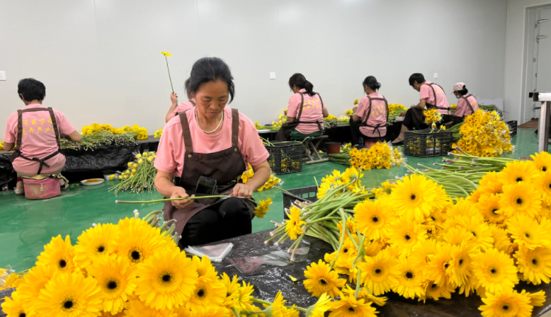 Recentemente, no Parque Industrial Agrícola Moderno Baisheng Wanfu, na cidade de Fangshan, região de Dingtao, trabalhadores estão ocupados embalando gérberas africanas. O parque possui infraestrutura como estufas de vidro, estufas de luz solar e instalações para a criação e cultivo de flores. Anualmente, são produzidas 25 milhões de hastes de gérberas africanas frescas, que são principalmente vendidas para cidades próximas como Linyi, Zhengzhou e Xuzhou, gerando empregos e aumentando a renda de mais de 200 pessoas da comunidade local.