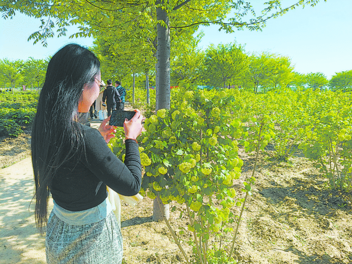 Sob a filosofia “quatro estações de florescência”, o jardim integra espécies internacionais como hortênsias europeias (Hydrangea paniculata), glicínias japonesas e clematites alpinas. Esse planejamento fenológico garante um calendário floral contínuo, permitindo que os 500 mil visitantes anuais desfrutem de diferentes experiências sensoriais a cada estação.