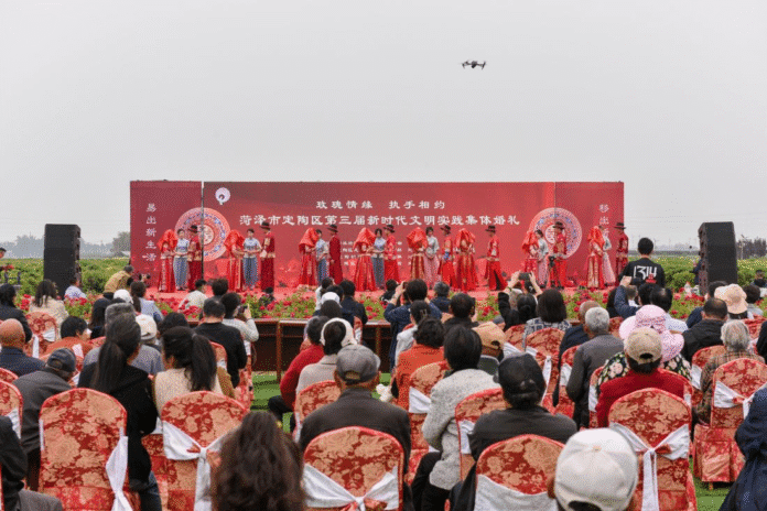 Este é o terceiro ano em que Dingtao realiza o casamento coletivo “Laços de Rosas, Mãos Dadas”, parte do movimento de Civilização da Nova Era. O objetivo é promover novos costumes matrimoniais e oferecer aos casais uma experiência única e memorável.