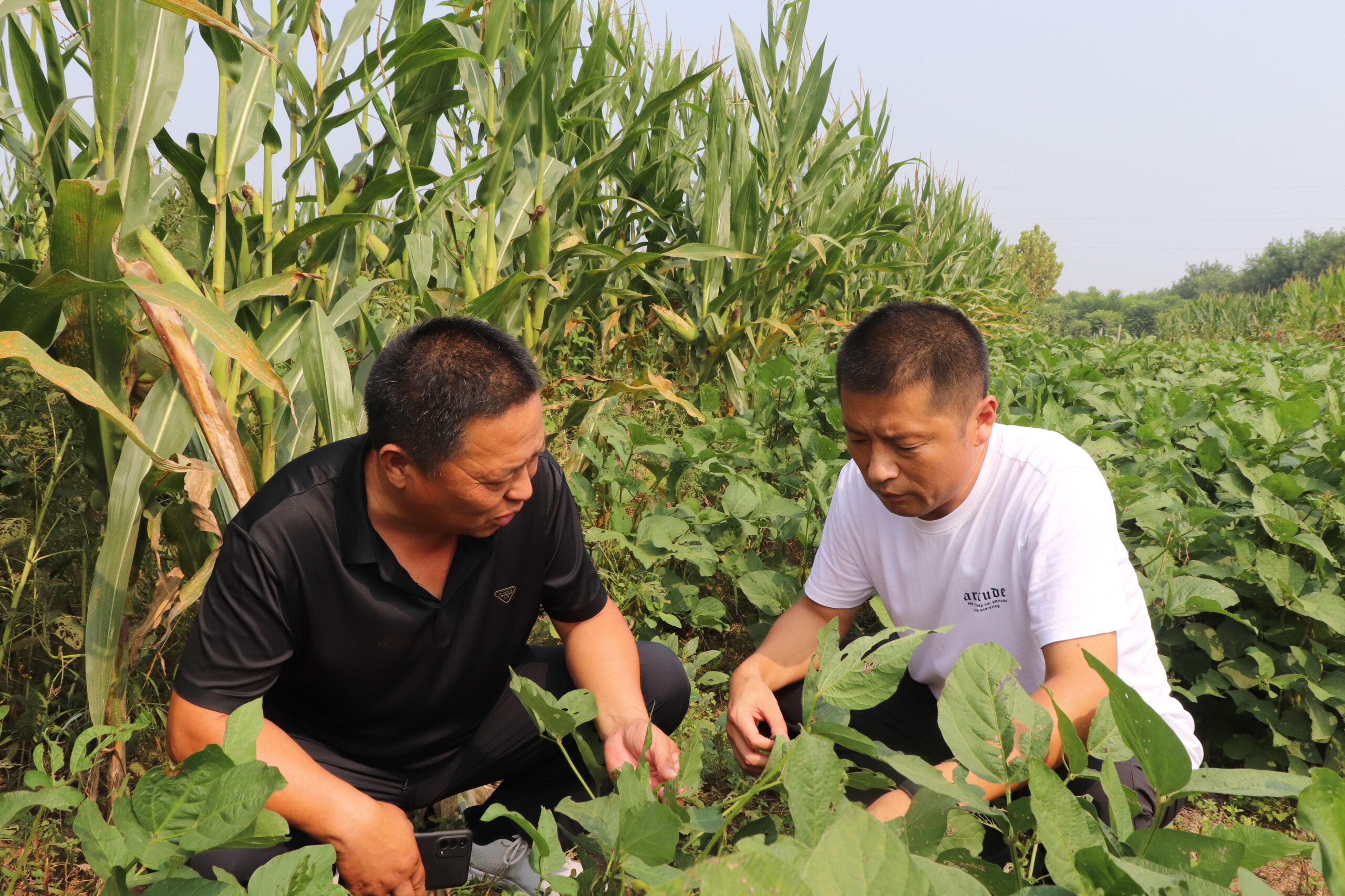 Recentemente, na cidade de Heze, província de Shandong, o agrônomo Zhang Yong (à direita) esteve nos campos agrícolas de Xu Changmiao, na vila Xu Zhuang, para discutir a situação de crescimento do milho e da soja plantados juntos. Atualmente, é um período crucial para o milho florescer e engrossar, enquanto a soja está quase pronta para ser colhida. Zhang Yong detalhou os pontos a serem observados nesta fase de crescimento. Nos últimos anos, a liderança de Xu Zhuang Village tem incentivado os moradores a adotarem técnicas de cultivo combinado para aumentar sua renda, ajudando-os a prosperar.