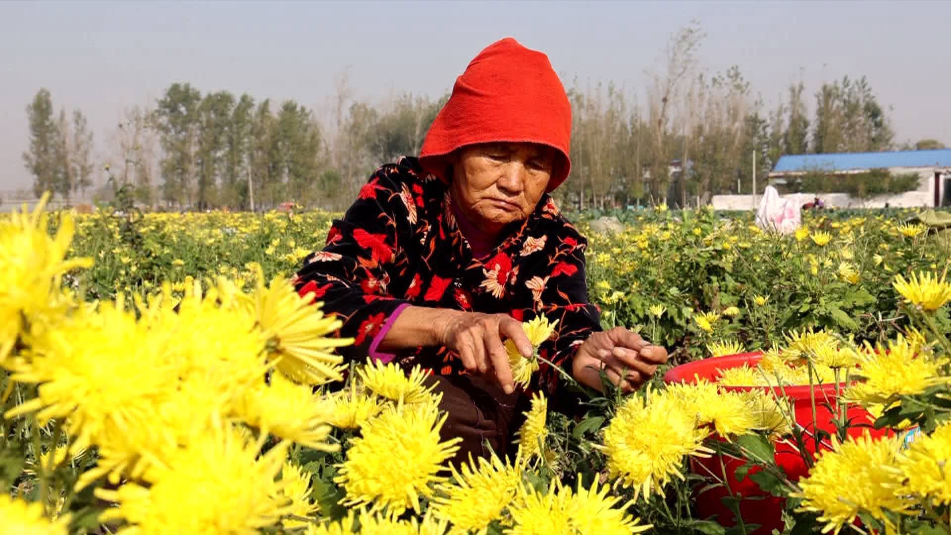 Ao entrar na base de cultivo do crisântemo na aldeia de Shizhai, na cidade de Heze, província de Shandong, vê-se crisântemos desabrochando por toda parte, com botões pontilhando os ramos e encantando a vista. Dúzias de trabalhadores movem-se entre as flores, colhendo e pesando, em um cenário de colheita abundante.