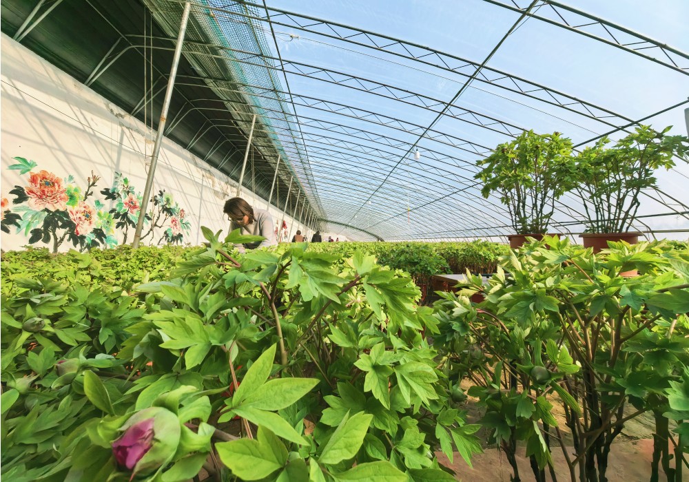A base é considerada uma das mais importantes da cidade para o cultivo de peônias forçadas. Nas estufas, são cultivadas diversas variedades, como Er Qiao, Wu Long Peng Sheng, Lü Mu Yin Yu, Xue Ying Tao Hua e Yu Mian Tao Hua. Após mais de 20 dias em ambiente controlado — período que inclui etapas como irrigação, fortalecimento das raízes e manejo dos botões —, cada vaso apresenta sinais claros de vitalidade. Os botões florais geralmente superam 1 centímetro de diâmetro, os novos ramos alcançam entre 20 e 30 centímetros de comprimento e as folhas exibem um verde intenso e saudável.