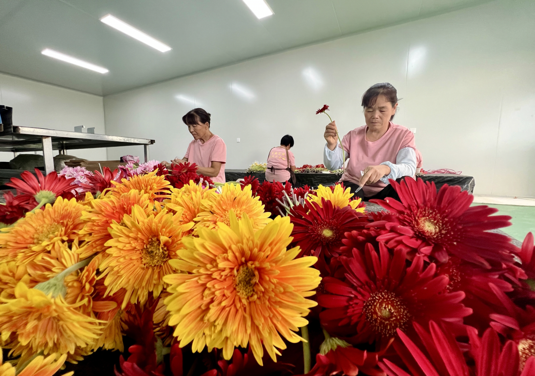 Na sala de embalagem e preparação do Parque Industrial Agrícola Moderno Baisheng Wanfuhua, no distrito de Dingtao, cidade de Heze, os trabalhadores estão ocupados separando e embalando produtos. Nas estufas próximas, fileiras de gérberas (margaridas africanas) crescem em direção ao sol, enquanto os trabalhadores se movimentam entre as flores, escolhendo e colhendo cuidadosamente.