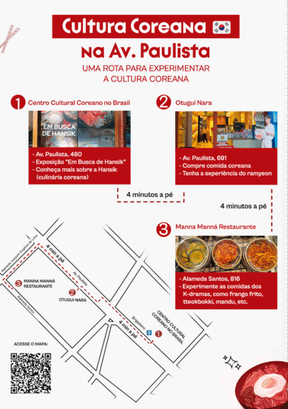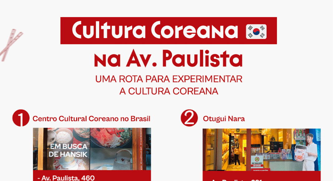 Quem quiser conhecer um pouco da cultura coreana, pode contar com um roteiro que pode ser feito totalmente a pé nas proximidades da Av. Paulista em São Paulo. O Centro Cultural Coreano no Brasil (CCCB) criou uma rota com apenas 4 minutos de caminhada entre cada uma para quem quiser saber mais sobre a gastronomia e a história da Coreia do Sul, além de poder fazer umas comprinhas. Veja as dicas:
